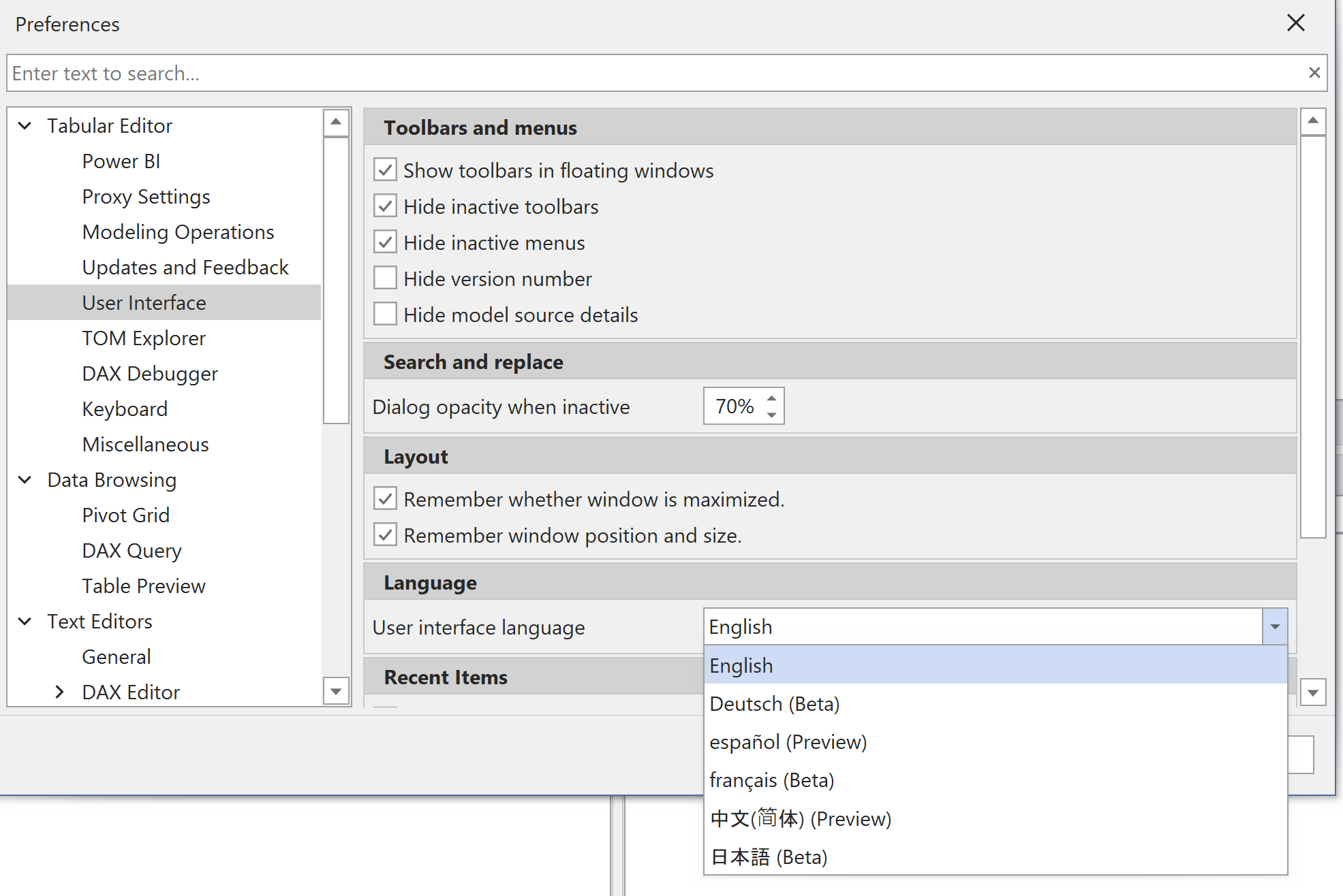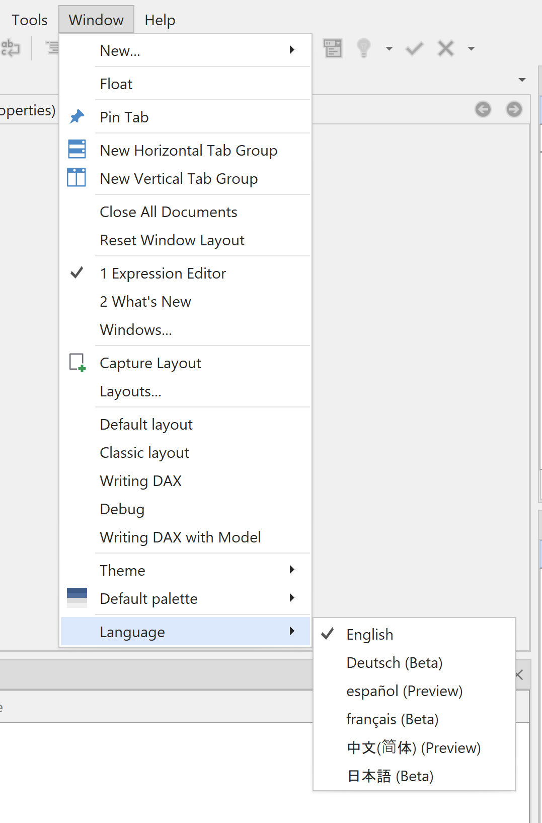 Tabular Editor 3 supports multiple UI languages. You can switch between them at any time.